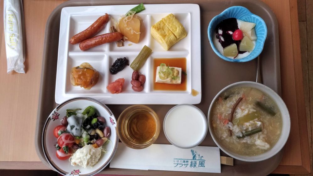 房間是傳統的日式榻榻米,但乾淨無異味,窗戶望出去就是後山的迷你高爾夫球場,遠處就是十勝連峰,窗景有如山水畫;晚餐在餐廳享用,只接待住客,純泡湯的過客只能選擇溫泉設施旁的簡易餐食,雖然只選了最便宜的方案,但是晚餐質量兼備,料理像懷石般逐道上菜,道道皆是剛煮好的美味,超值到破表;早餐採自助餐式,種類雖不多,但品質佳,也算上選。