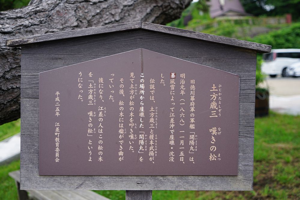 位在舊檜山爾志郡役所」前,有一株斜向生長、造型奇特的松樹。據傳是當時土方歲三在山坡上,看到開陽丸在江差外海觸礁沉沒,一邊留下悔恨的眼淚,一邊嘆氣敲打樹木而造成奇特的形狀,我想穿鑿附會的成分應該居多,但也因如此,悲劇英雄又多了個傳奇故事。