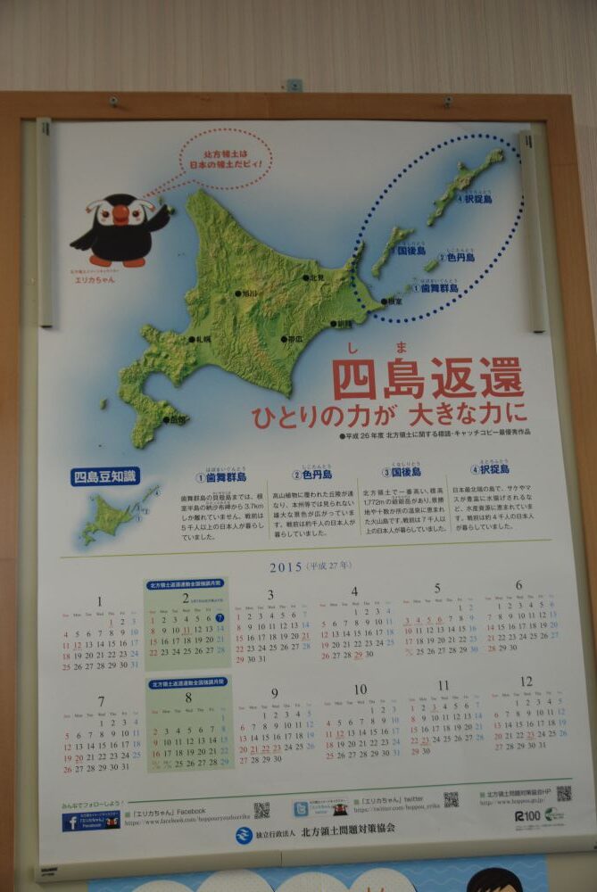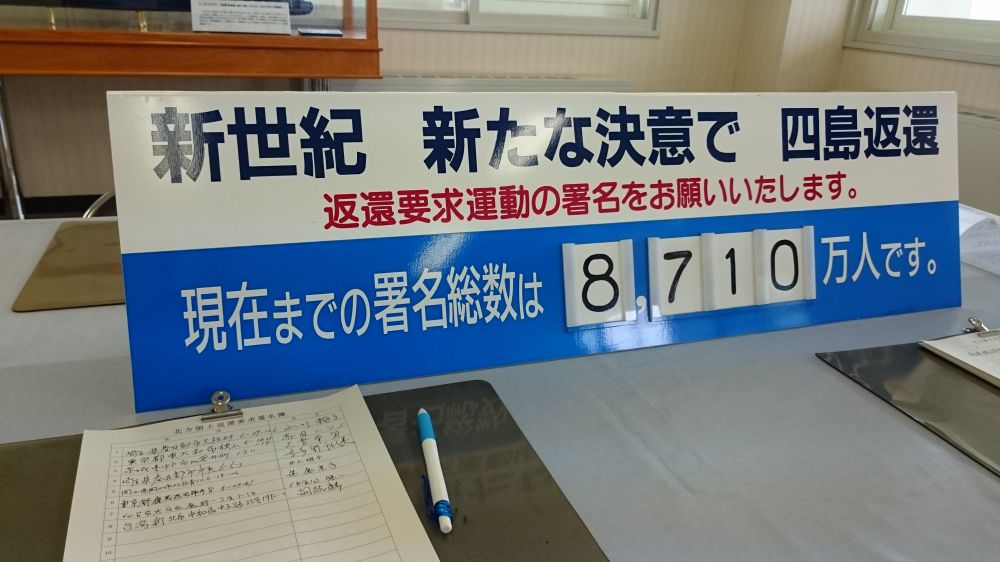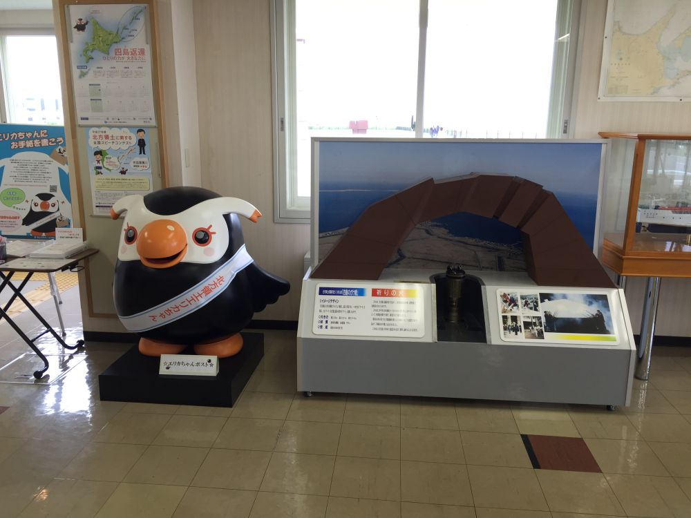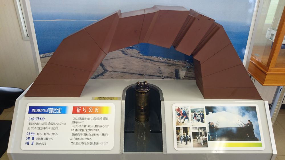 這裡的建設、商店命名也都跟北方四島的主權脫不了關係,商店取名「望鄉之家」,交流中心命名為「北方館」,裡面介紹了北方四島爭議的歷史,還有要求返還的簽名活動,當然姊姊也去簽名聲援一下,搞不好北海道又多了幾個島可以觀光,連廣場的大型藝術擺設物都叫「四島のかけ橋」,目的是希望能將北方四島和日本國土連接起來,下方還有聖火台,聖火台的燃油還是大老遠從日本最南的波照間島開採運來的,好像在聲明日本領土一塊都不能少,感覺上執念很深啊……