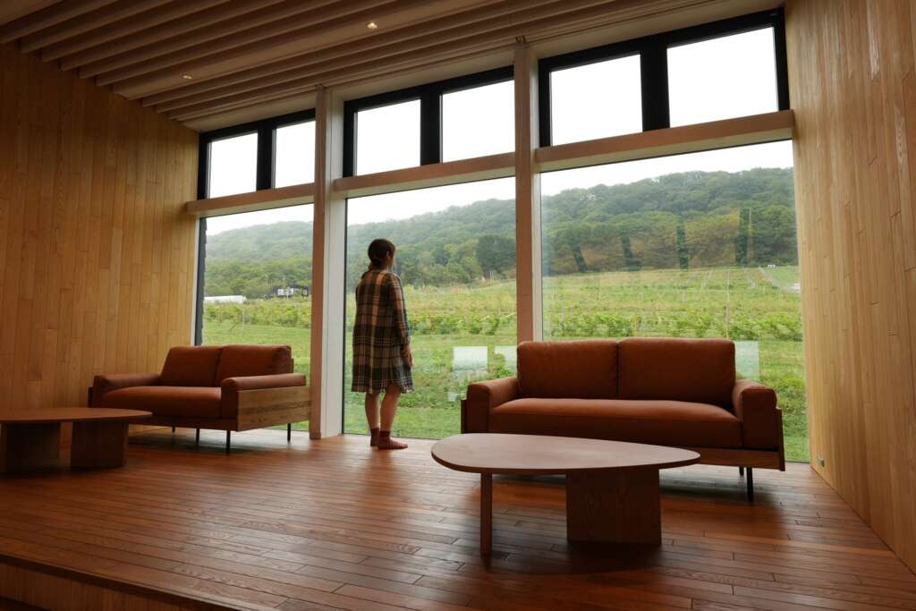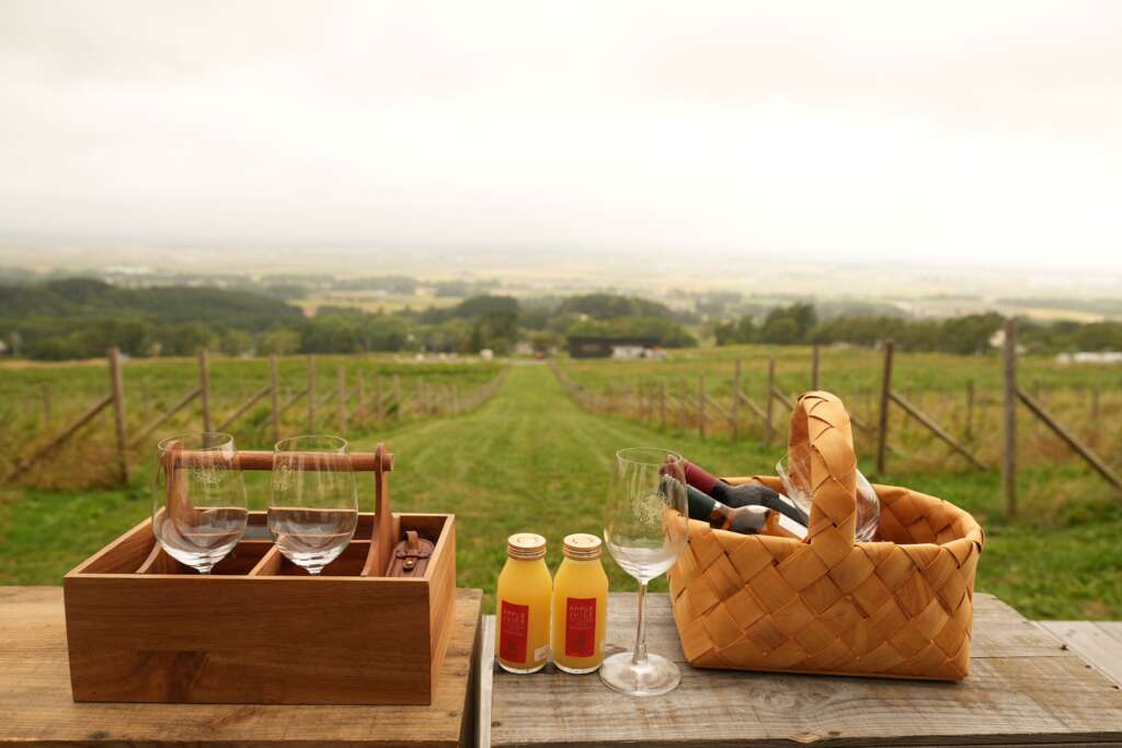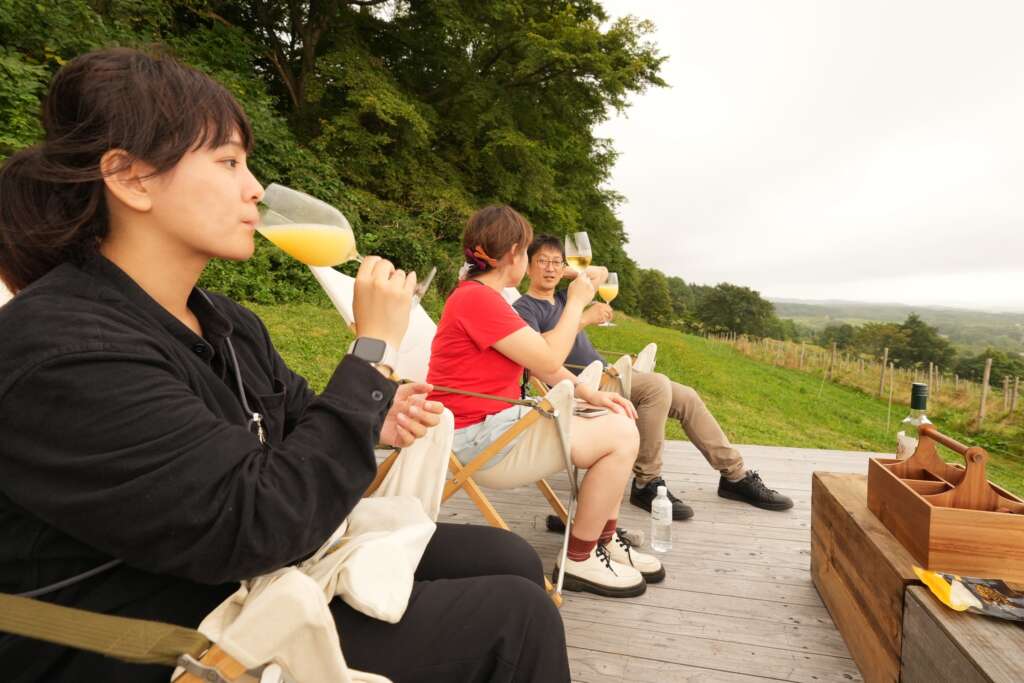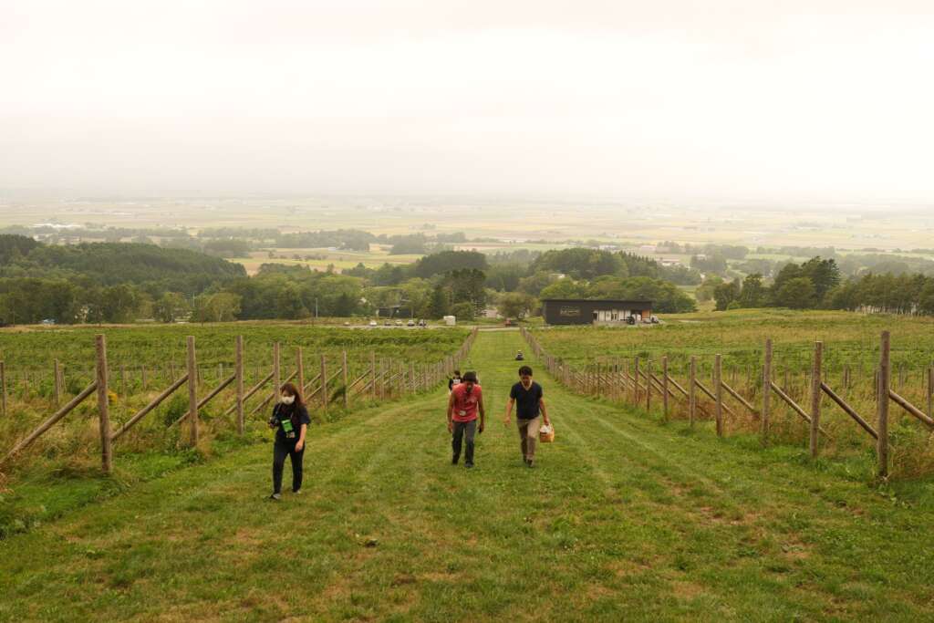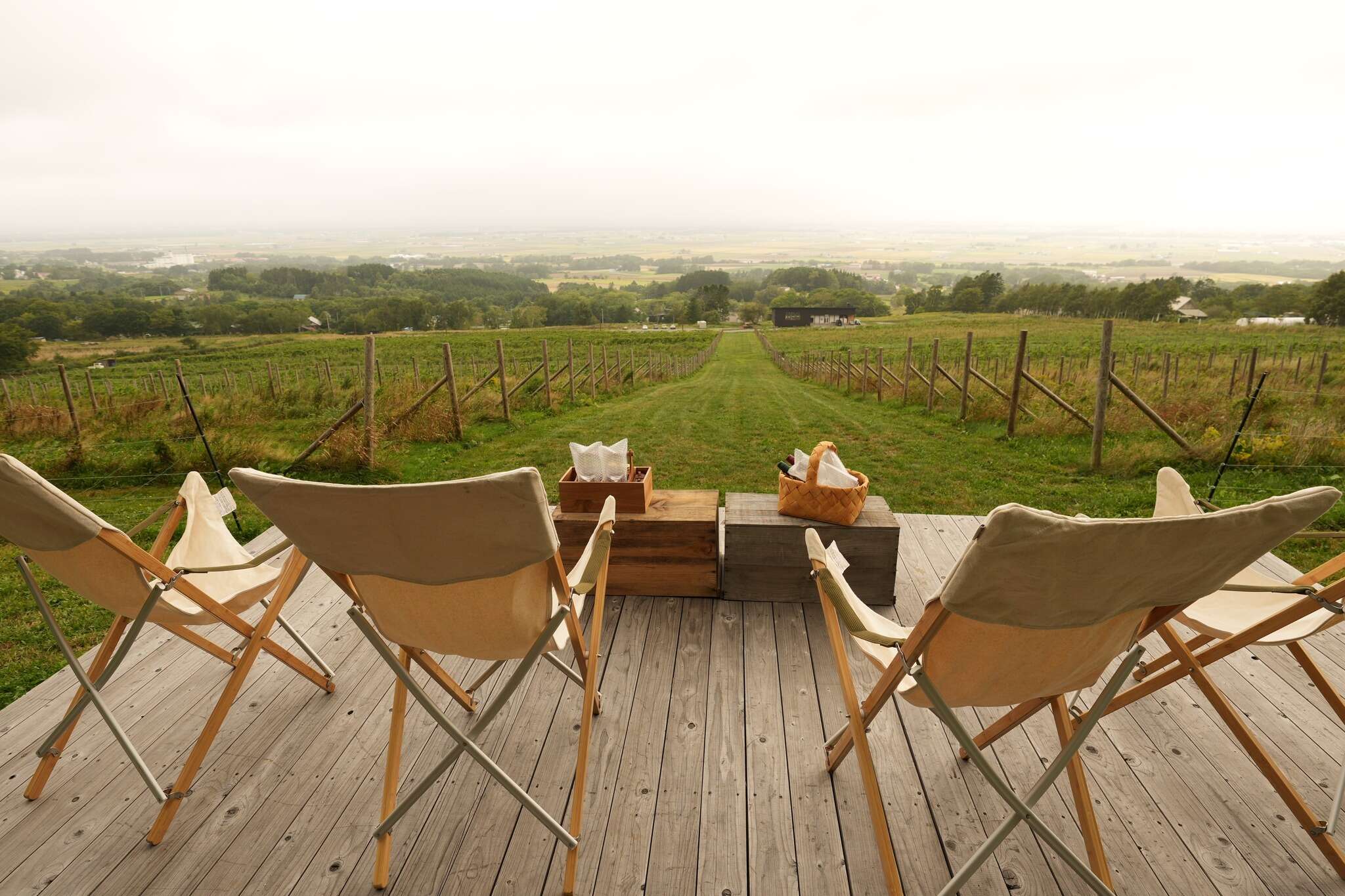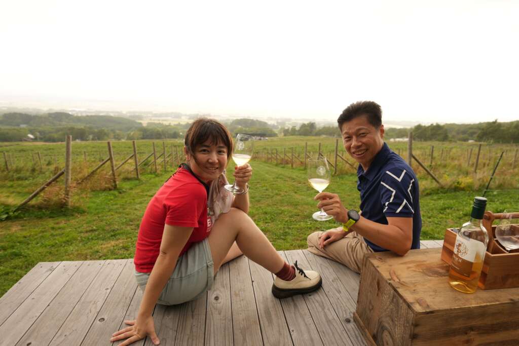 氣喘吁吁登上觀景台,俯瞰葡萄酒園並遠眺石狩平原,夕陽西下、秋夕晚風,搭配酒莊自產當季新酒,人生幾何,夫復何求!