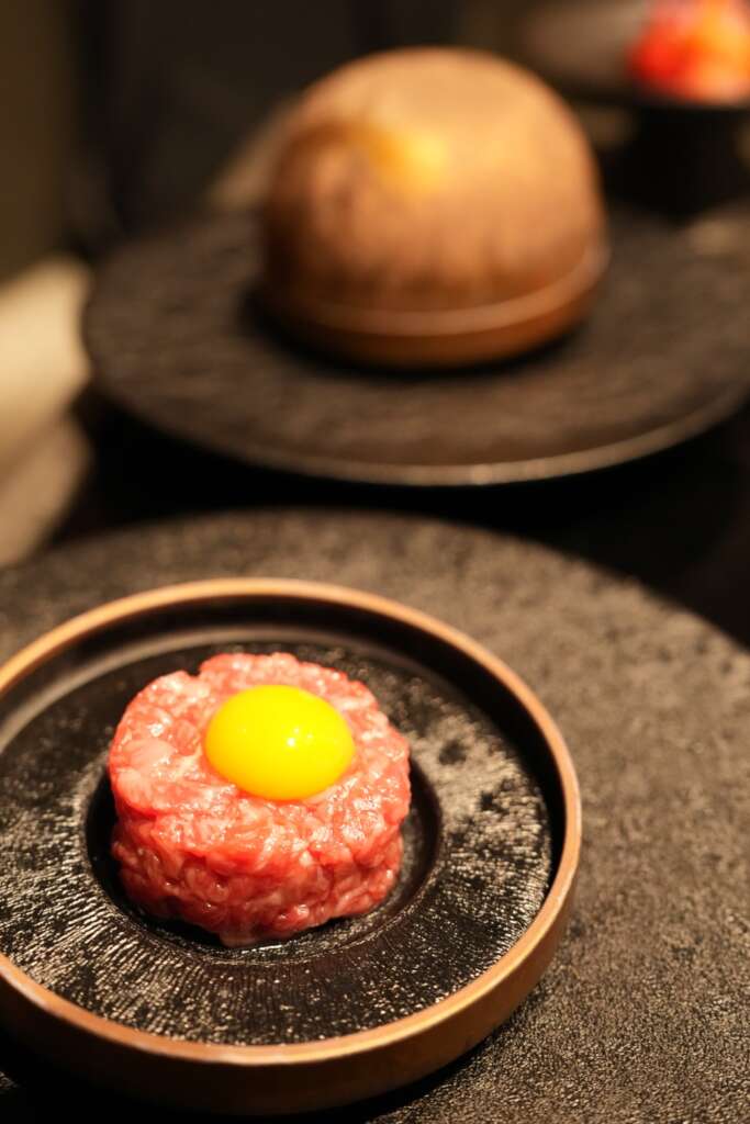 晶亮的生鮮美瑛牛絞肉,打上亮橘色搶眼生雞蛋黃,攪拌混合後食用,滑嫩濃郁全無腥味,請勇敢嘗試