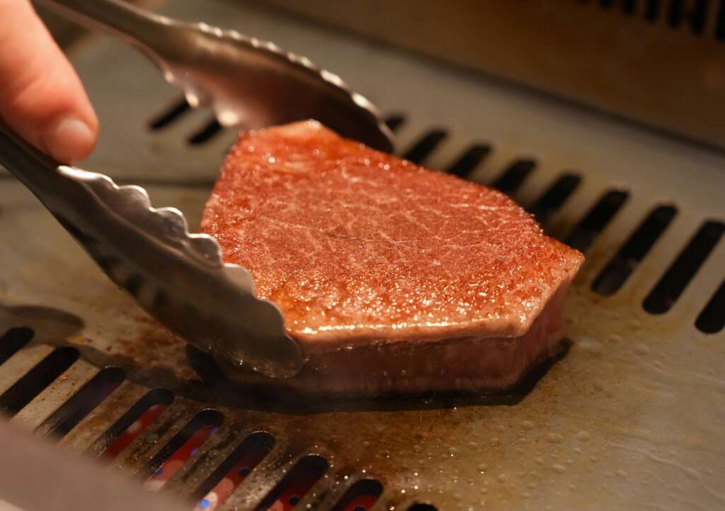 和牛雖美味,但油脂比例高,多吃幾塊就有點膩,所以老闆特別選擇油脂含量較少的知床牛,而且提供最頂級,一頭牛僅切取3-4塊的「夏多布里昂」,赤身部位卻帶有細緻大理石油花,軟嫩卻不油膩的絕妙滋味的極品食材,厚切炙燒後靜置數分鐘後在回爐上鎖住表面,料理時油脂香甜味溢滿個室,切開斷面從巧克力外觀到粉嫩中心,令人食指大動,沾上主廚特調的和牛醬汁、岩鹽、白山葵等食用,放入口中味蕾的衝擊,讓人魂牽夢縈,難以忘懷。