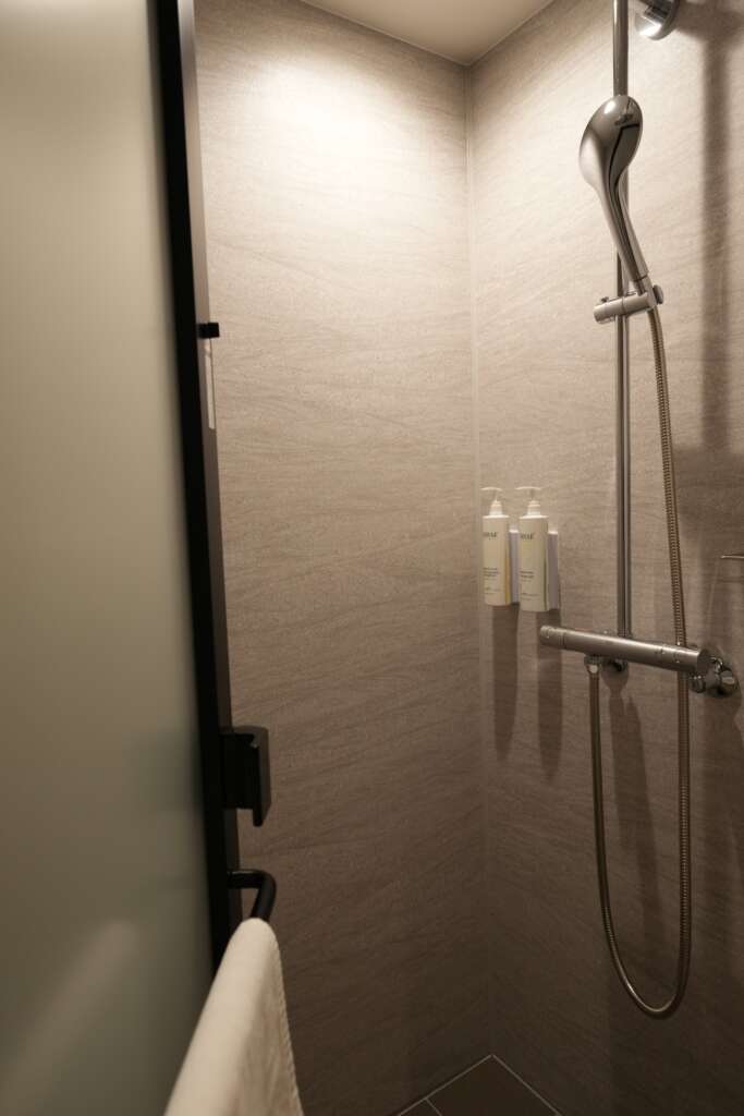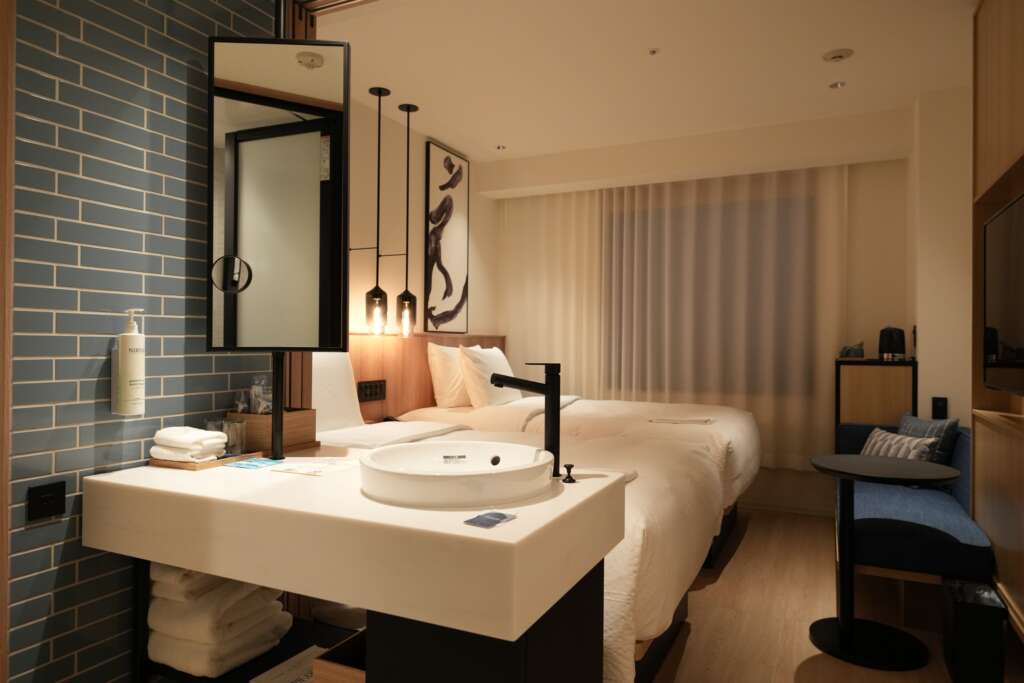 在北海道的據點有3家,分別是惠庭、長沼和南富良野,飯店外觀相當一致,簡約淡雅的淺色長條建物,樓層低矮,不會造成景觀衝突,姊下榻的是長沼,2022年5月新開幕,客房數78間,地理位置緊鄰道の駅「マオイの丘公園」,離新千歲機僅40分鐘車程,可以當作訪北海道第一或最後一晚的住宿。